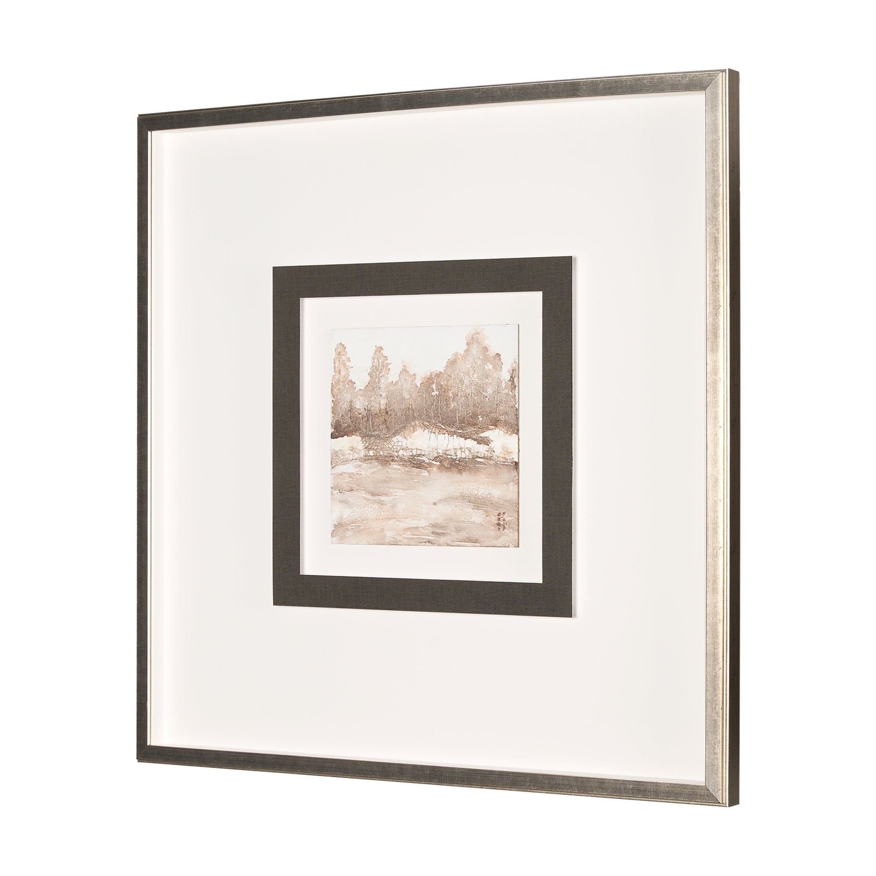 "Field View" by Studio M is a captivating landscape depiction, capturing the serene essence of a wooded horizon with earthy tones and delicate textures. The artist's mastery in creating a harmonious blend of muted browns and subtle whites is exhibited in each handmade, hand-embellished piece, offering a glimpse into tranquil natural beauty. Set in an exquisite champagne-toned frame under glass, this piece is a timeless addition to any space.