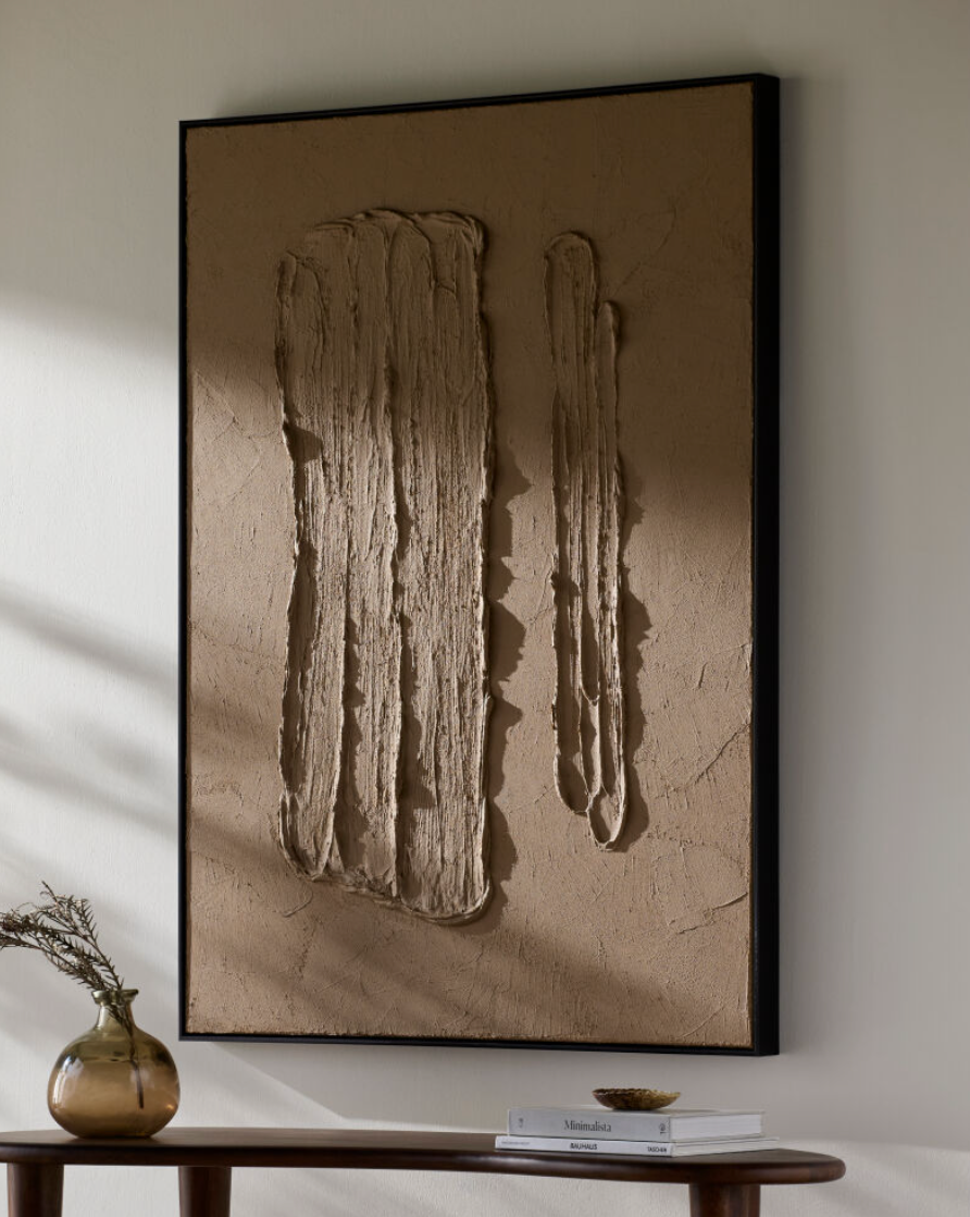 Elevate your space with the Hemkund Framed Art, a striking textured piece crafted from 100% hand-painted canvas. The artwork’s dramatic design is enhanced by a sleek matte black frame, marrying modern style with tactile depth. This expertly finished piece delivers a stunning visual impact, perfect for adding sophisticated character to any room.