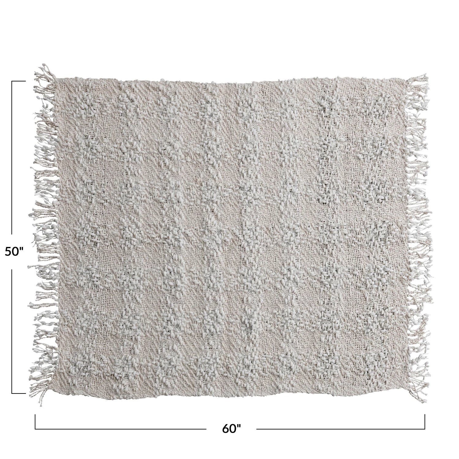 Transform any room aesthetic with this woven cotton blend cable knit throw with fringe in natural color. This throw blanket features a cable knit pattern that creates a sophisticated and cozy look. The fringe trim adds some flair and movement to the edges of the throw. The natural color is neutral and elegant and can blend with any color scheme or theme. This throw blanket is ideal for providing a rugged texture and stylish accent to a modern or rustic space in the home or office. Use it to decorate the sofa, bed, chair, or desk. It is made from a cotton and polyester blend, a durable and soft material that is warm and comfortable. The throw blanket measures 60 inches long by 50 inches wide, a versatile size for draping or covering. Keep the throw clean and fresh; just machine wash on a gentle cycle, tumble dry low, or hand wash and iron if needed; do not use bleach. This woven cotton blend cable knit throw with fringe is a stylish and cozy piece that will elevate any room's aesthetic. A stylish and cozy throw blanket with a cable knit pattern and fringe trim. Ideal for providing rugged texture and stylish accent to a modern or rustic space, in the home or office. Machine wash on a gentle cycle and tumble dry low, or hand wash and iron if needed; do not use bleach. Made of cotton and polyester blend.