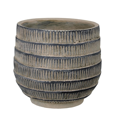 Constructed from sturdy cast cement with a ridged texture and soft patina finish this cachepot brings a rustic nod to garden decor. Watertight.