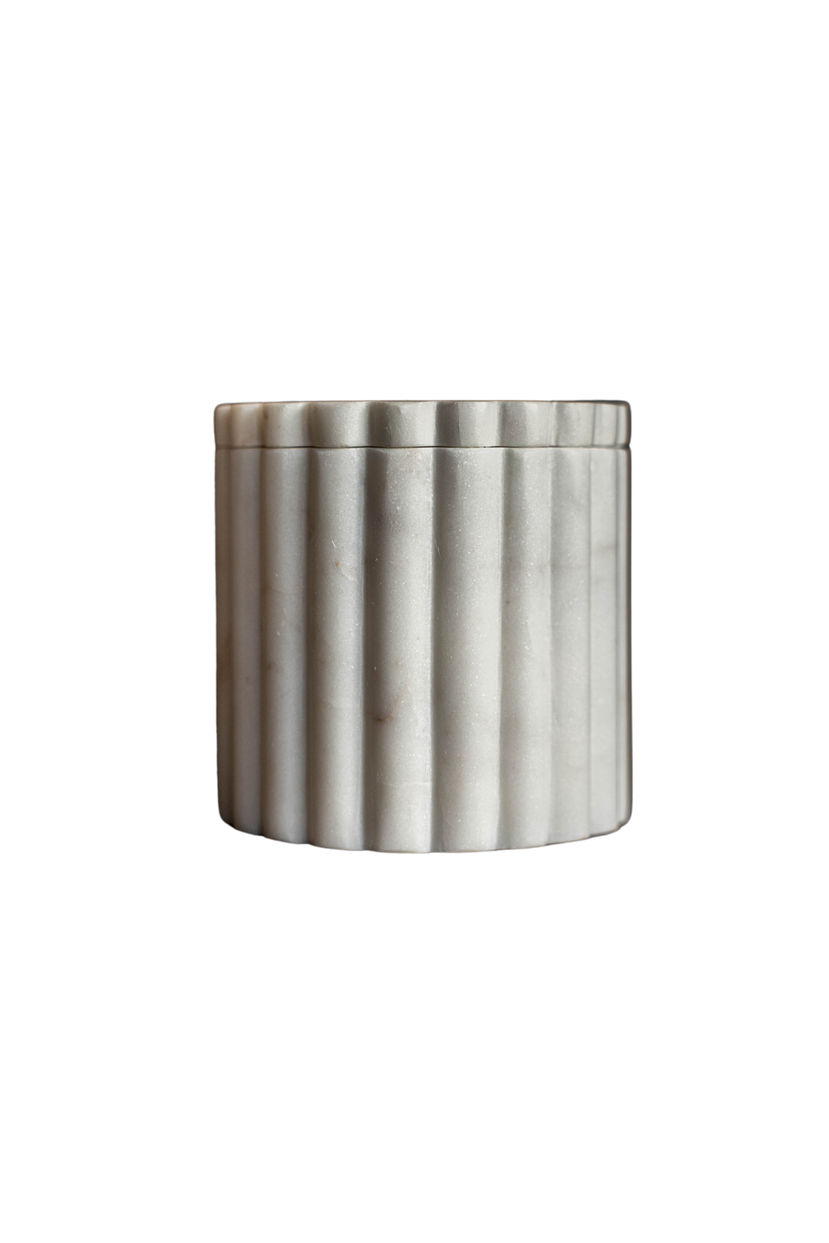 Dimensions 4"W x 4.5" H The White Marble Fluted Jar is a practical and stylish addition to any kitchen, bathroom, or living room. Its versatile design allows it to discreetly store and organize various items, making your space tidier.