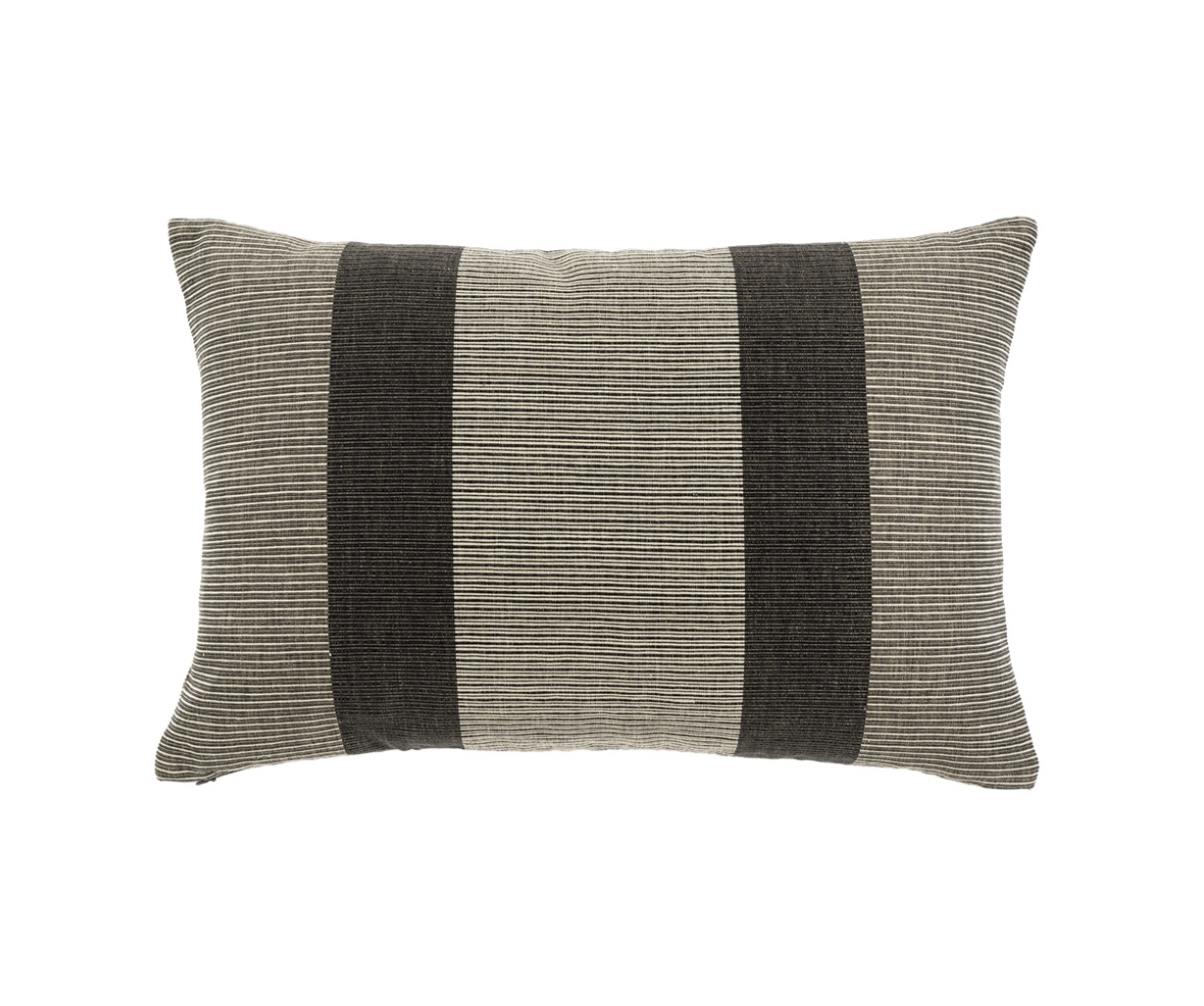 A rectangular throw pillow with a striped pattern in beige and brown colors.