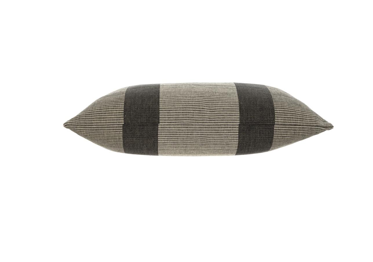 side view of grey striped pillow