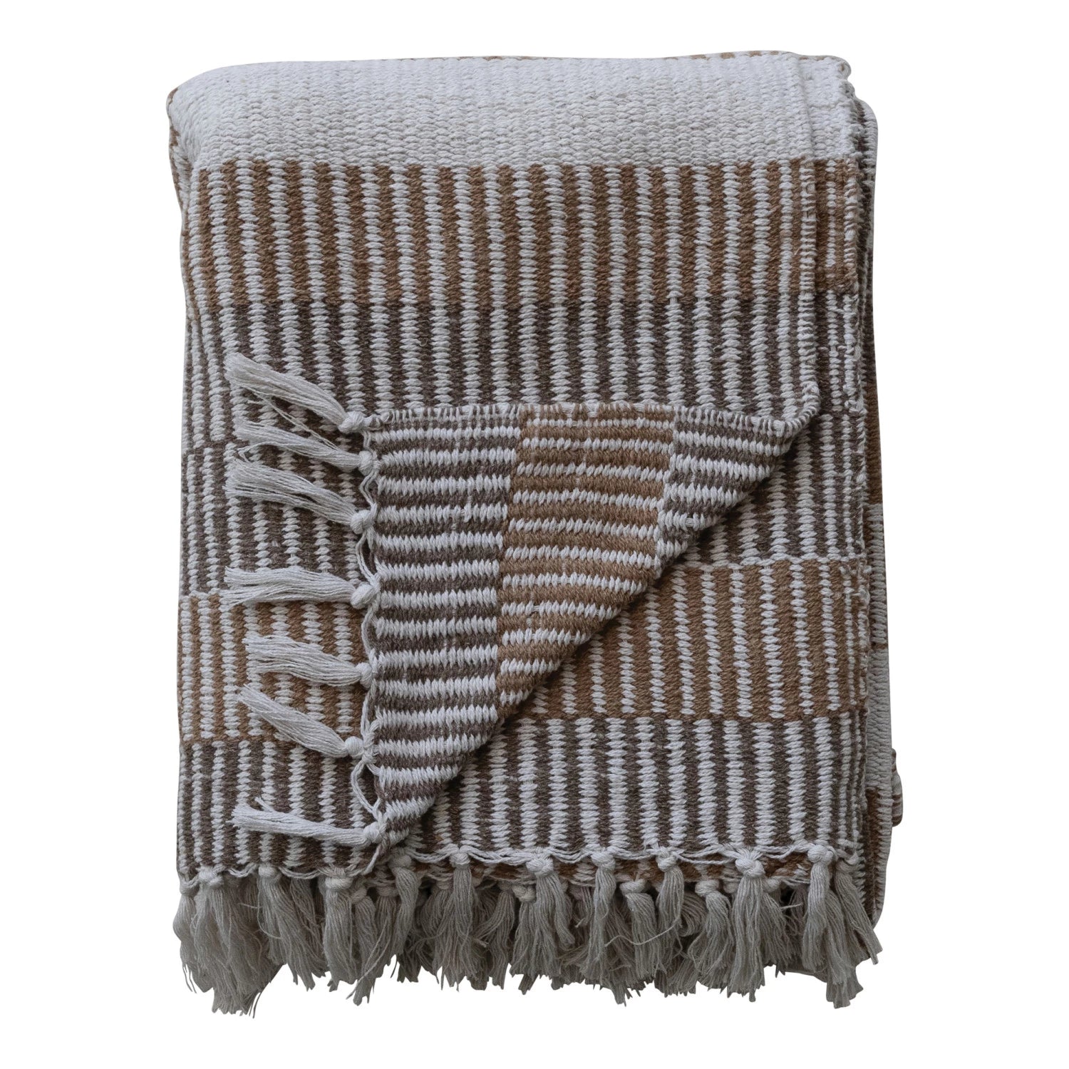 folded woven throw with stripes and fringes