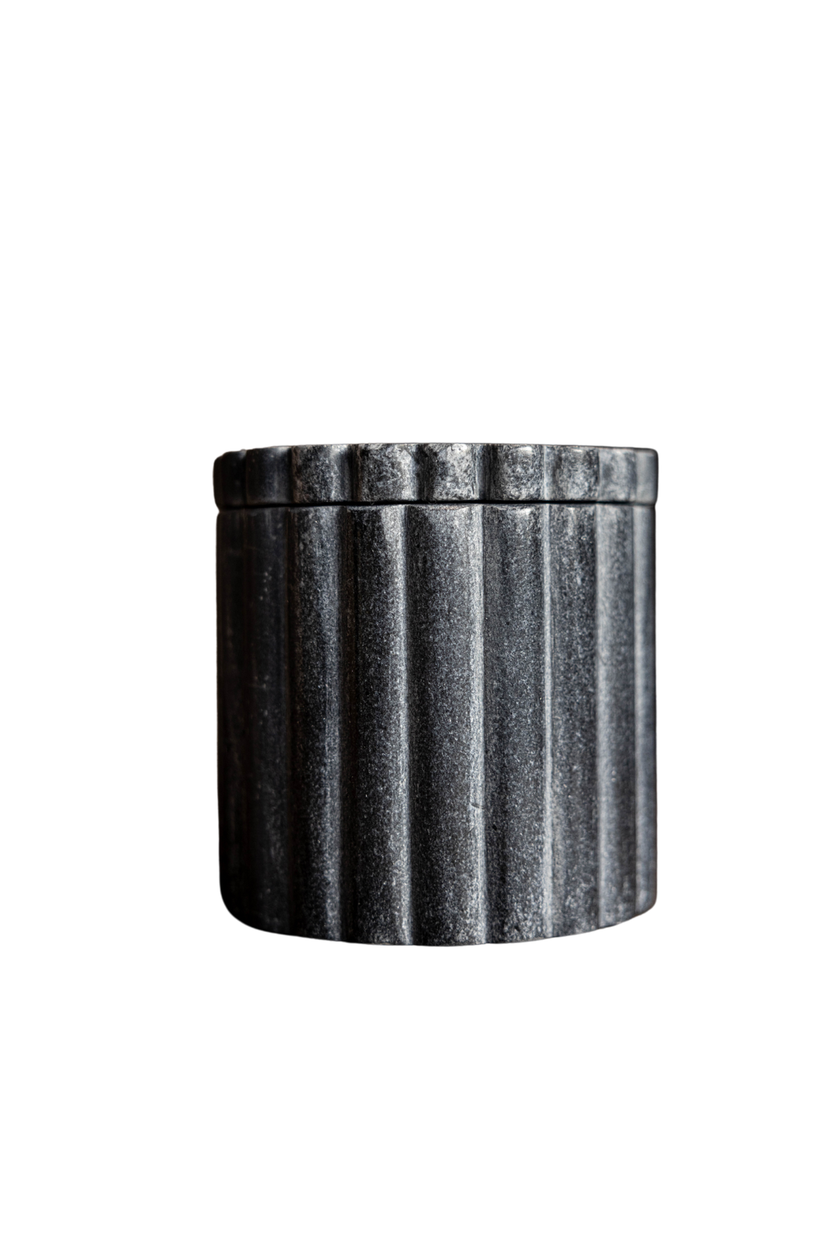 Dimensions 4"W x 4.5" H The Black Marble Fluted Jar is a practical and stylish addition to any kitchen, bathroom, or living room. Its versatile design allows it to discreetly store and organize various items, making your space tidier.