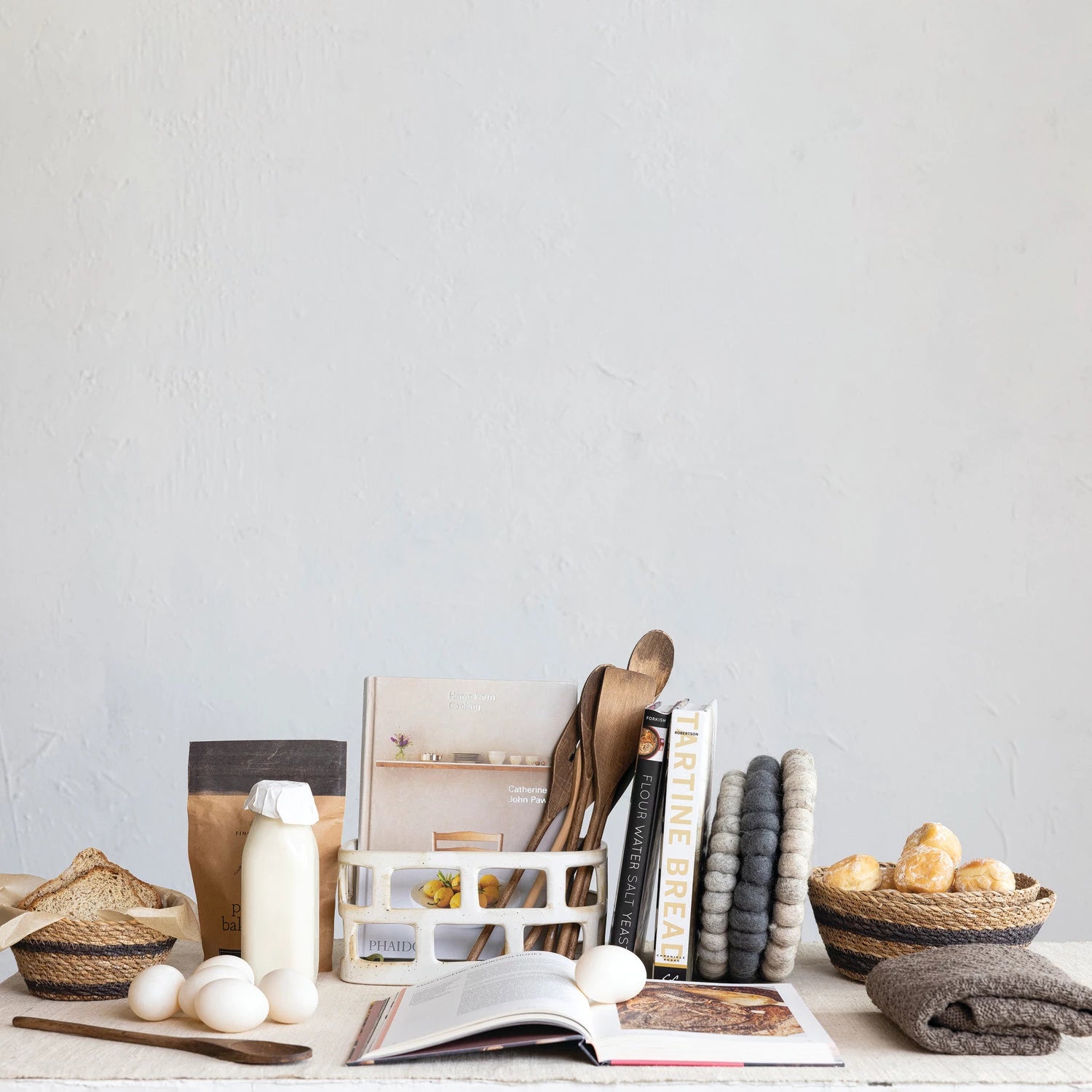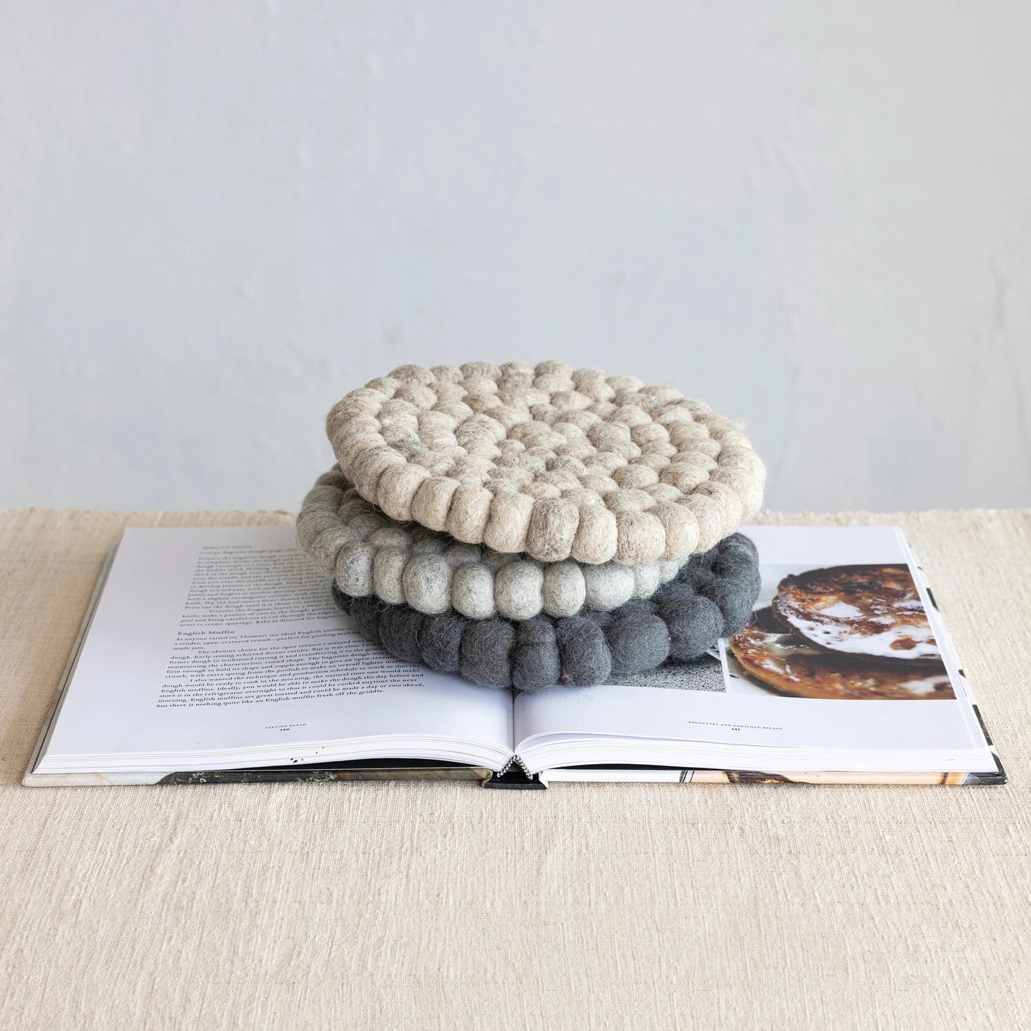 Crafted from tightly compressed wool felt balls, this 7-1/2" round trivet offers reliable heat protection for your surfaces. Available in three subtle tones—dark gray, taupe brown, and light gray—it combines practicality with understated style. The handmade construction ensures durability while adding a tactile, artisanal element to your kitchen or dining area. Ideal for safeguarding tables from hot pots and dishes without compromising on aesthetic appeal.
