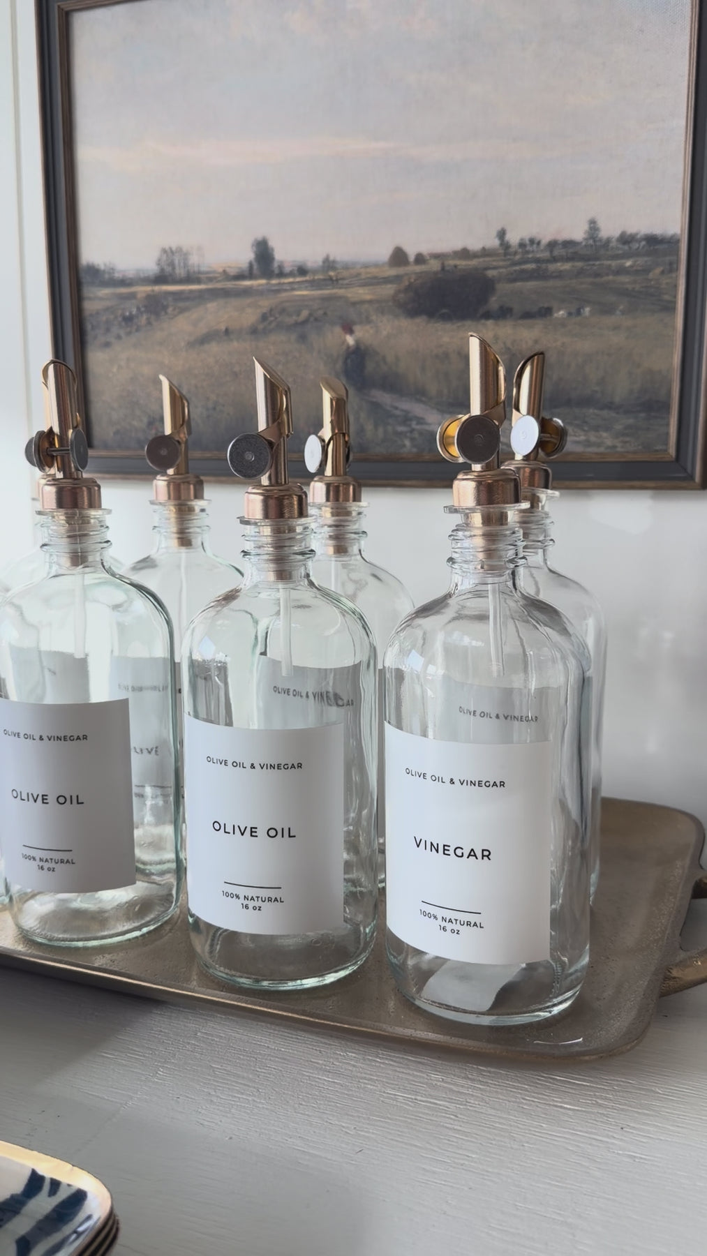 Elevate your kitchen essentials with these 16 oz clear glass bottles, designed specifically for olive oil and vinegar. Featuring a gold weighted spout, each bottle ensures precise pouring and controlled flow, minimizing mess and waste. Crafted from durable glass, they preserve the purity and flavor of your ingredients while adding a sophisticated touch to your countertop or dining table. Ideal for both everyday use and special occasions, these bottles combine functionality with elegant design.
