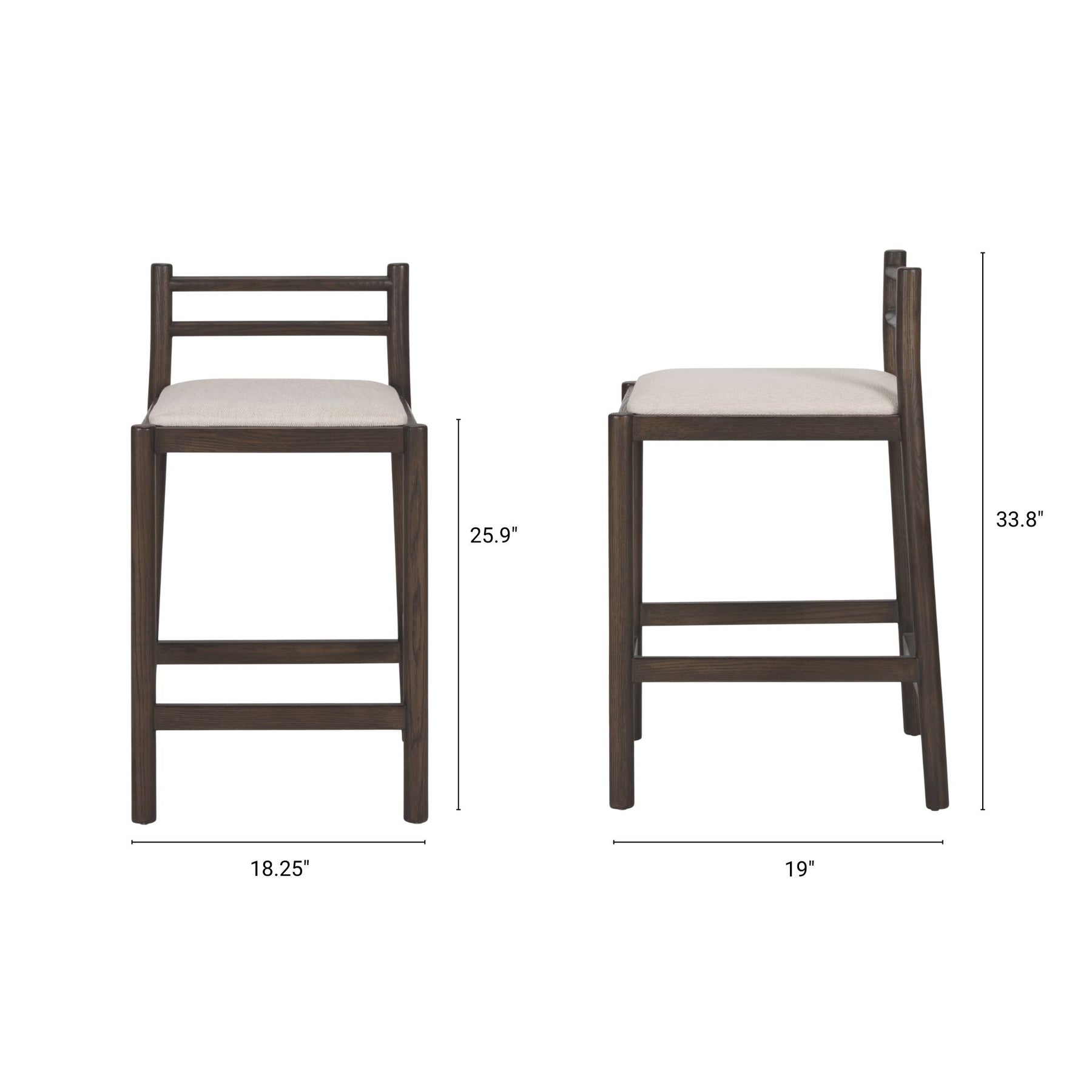 Sam Counter Stool with dark brown wooden legs and backrest finished with a cushioned cream fabric upholstered seat.