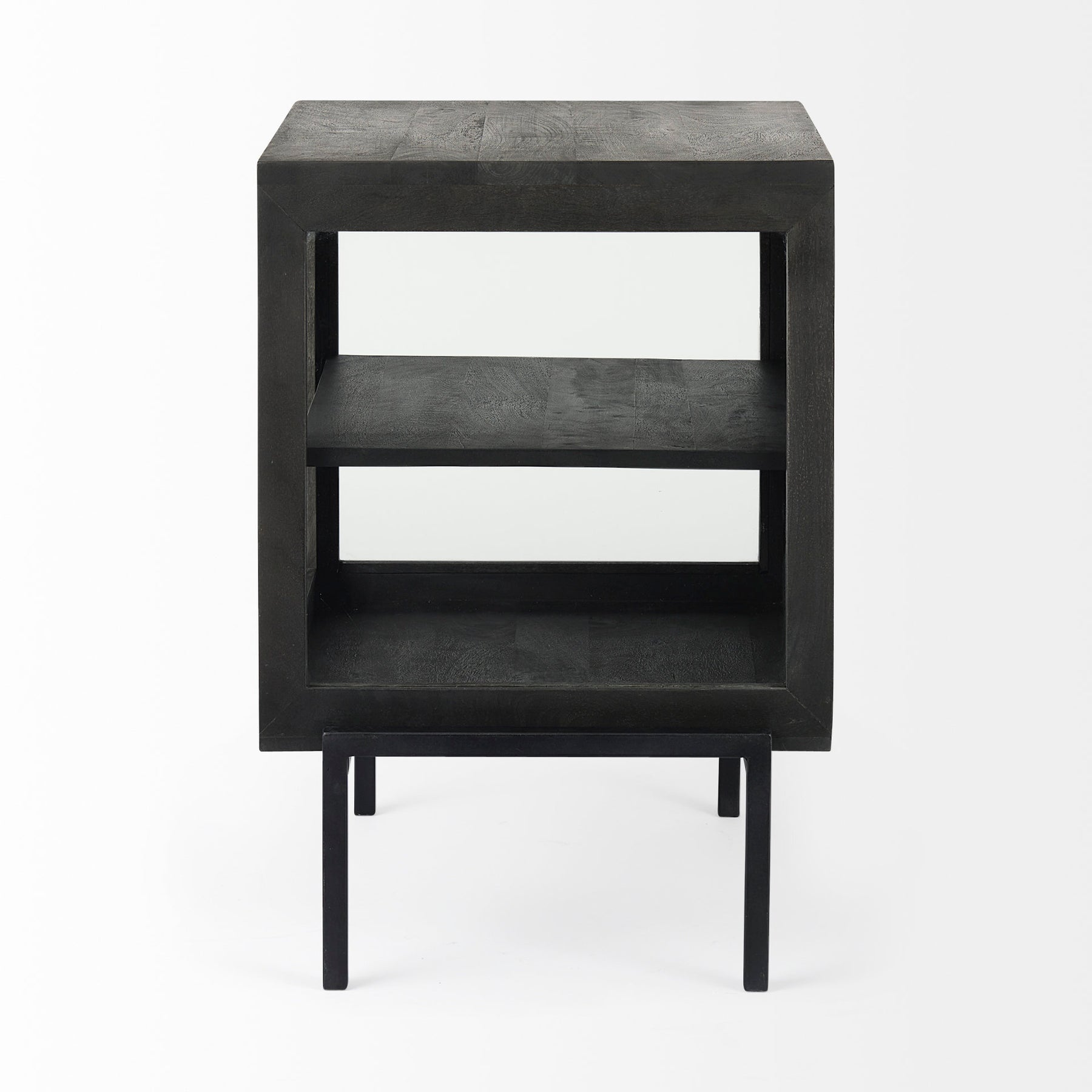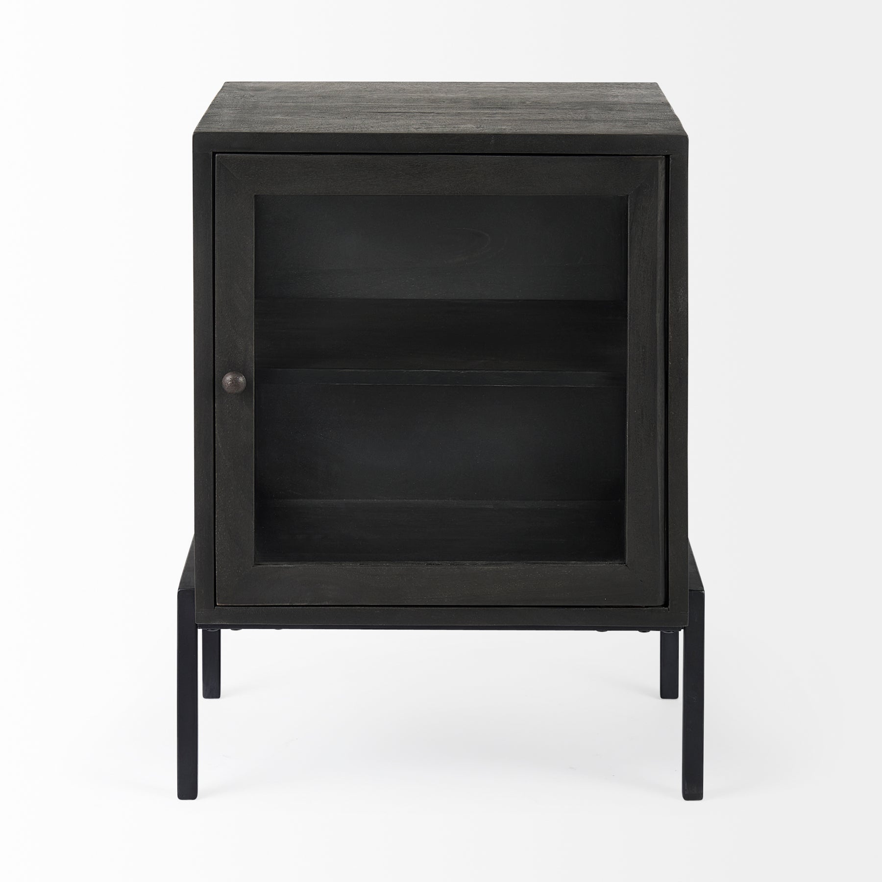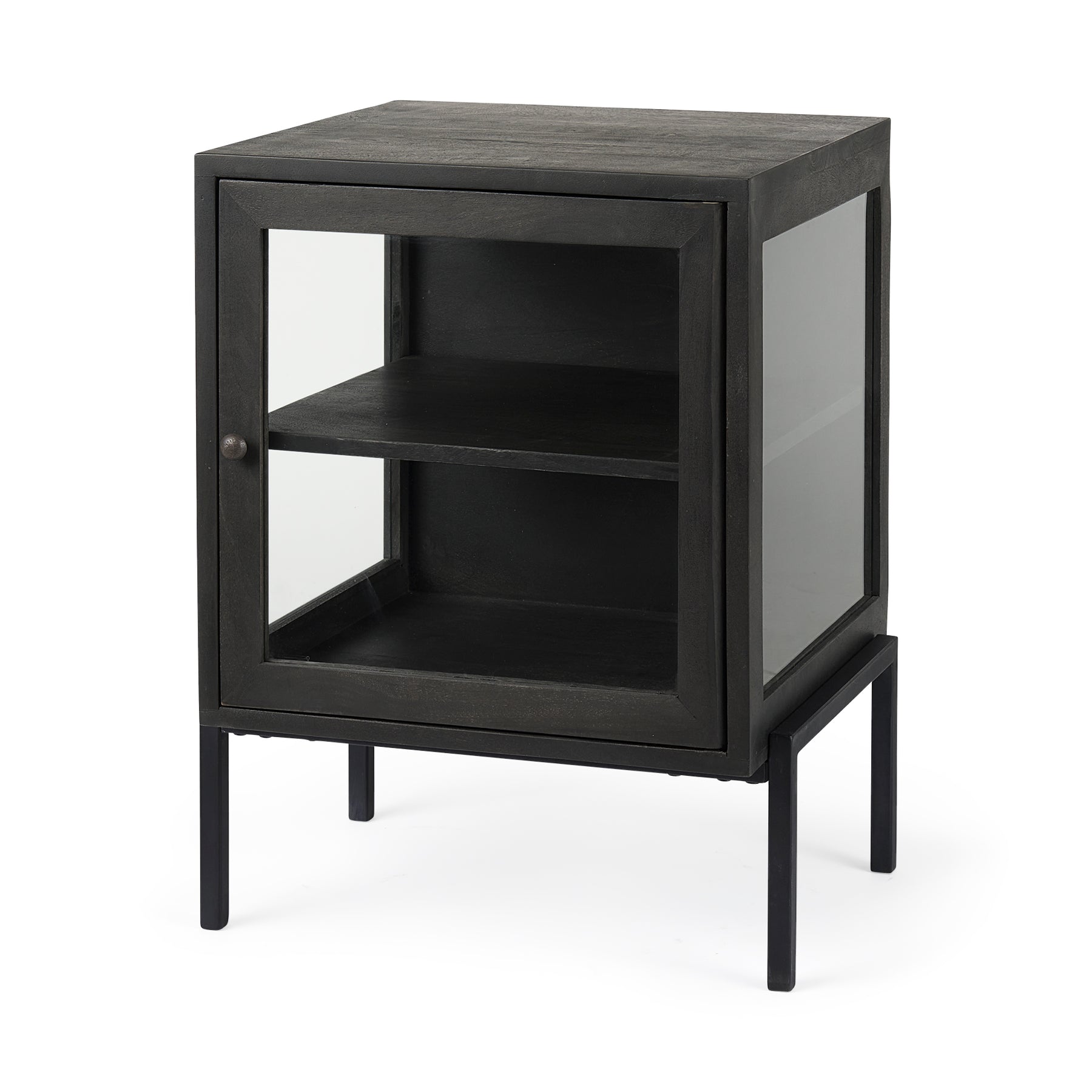 This modern side table features a shadowbox design with glass side panels and a glass door encased by a Mango wood frame on a sturdy iron base.