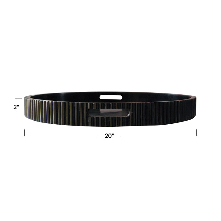 This resin pleated tray with handles in black is a beautiful and practical addition to any home. It is made of resin, which is a high-quality and durable material that is lightweight and easy to clean. It has a pleated design that creates a textured and elegant effect on the surface, making it a unique and eye-catching serveware. It has handles that make it easy to carry and transport. It has a round shape that is perfect for serving drinks, snacks, desserts, or appetizers, or for displaying candles, plants, or ornaments on a table or countertop. It can suit any farmhouse, industrial, vintage, or French country style kitchen or dining room.