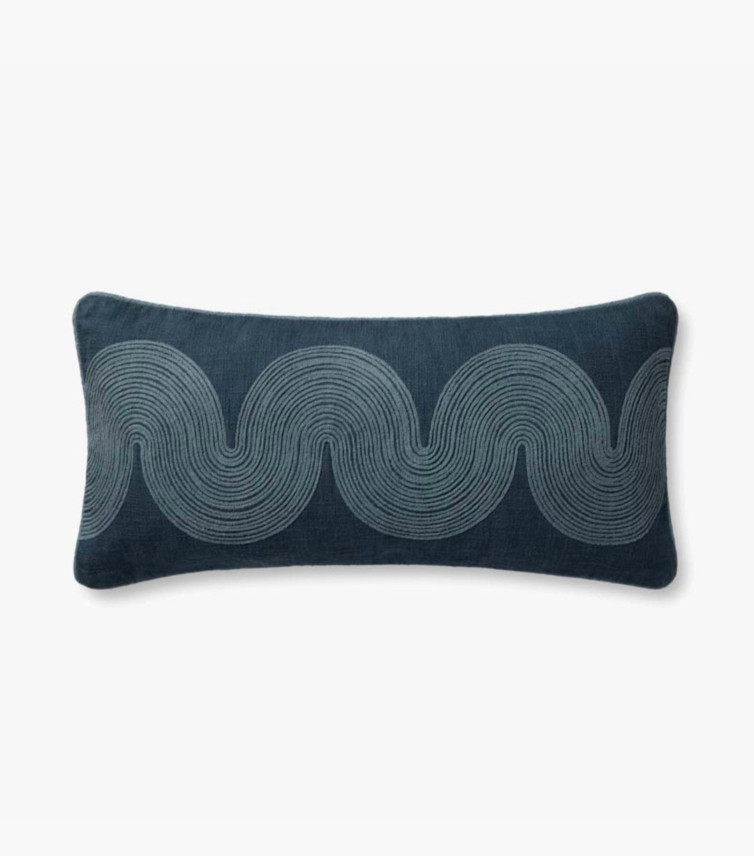 This oceanic blue throw pillow from Brigette Romanek x Loloi features a lighter-toned, embroidered wave design across its center. The pillow cover is 100% cotton and measures 12” x 27”, an elongated size to style in living rooms and bedrooms.