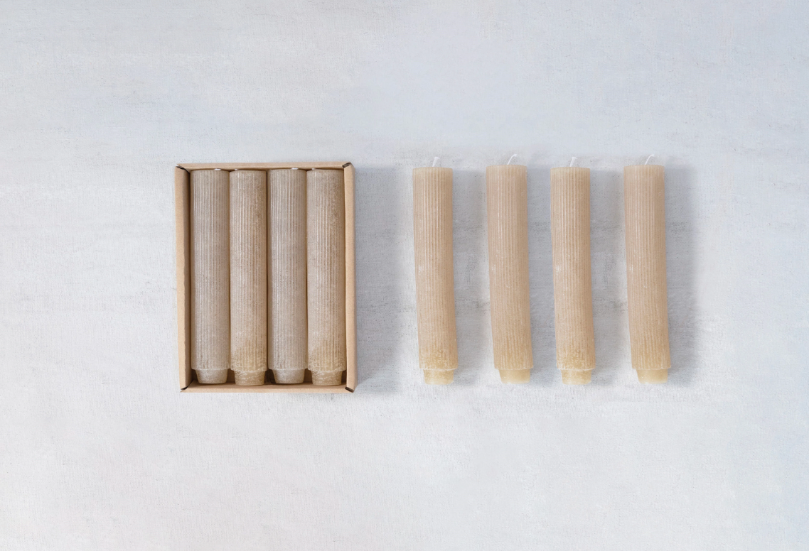 This intricately carved set of taper candles features a striking, sculpturesque pleated design. Set of 12 pleated taper candles in linen. Add warmth and elegance to any living or dining space with this stunning set of votive candles. Unscented; Made from 100% Paraffin Wax.